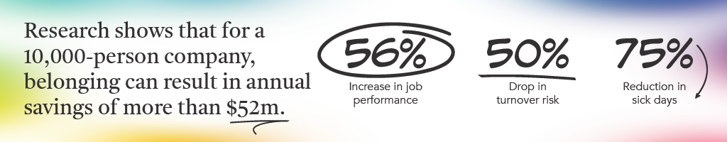 Research shows that for a 10,000-person company, belonging can result in annual savings of more than $52M. Unleash your organization’s full potential in a culture of acceptance and social connection— discover the bottom-line benefits of belonging. A high sense of belonging among workers was linked to a whopping 56% increase in job performance, a 50% drop in turnover risk, and a 75% reduction in sick days. (source)
